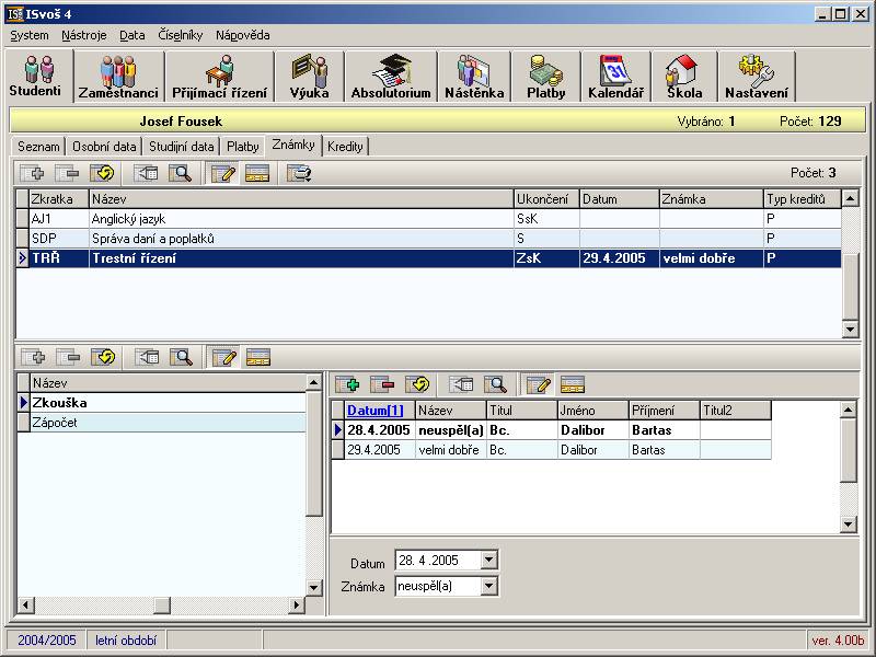 Přehled studijních výsledků každého studenta za celou dobu studia